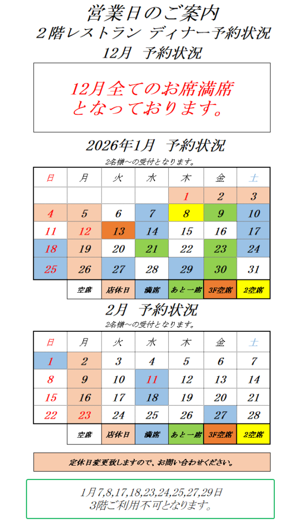 ホーム > お知らせ一覧 > お知らせ > 年末年始のお休み、空席情報更新致しました。(12月11日) 年末年始のお休み、空席情報更新致しました。(12月11日) 2025.12.11 お知らせ お知らせ一覧に戻る