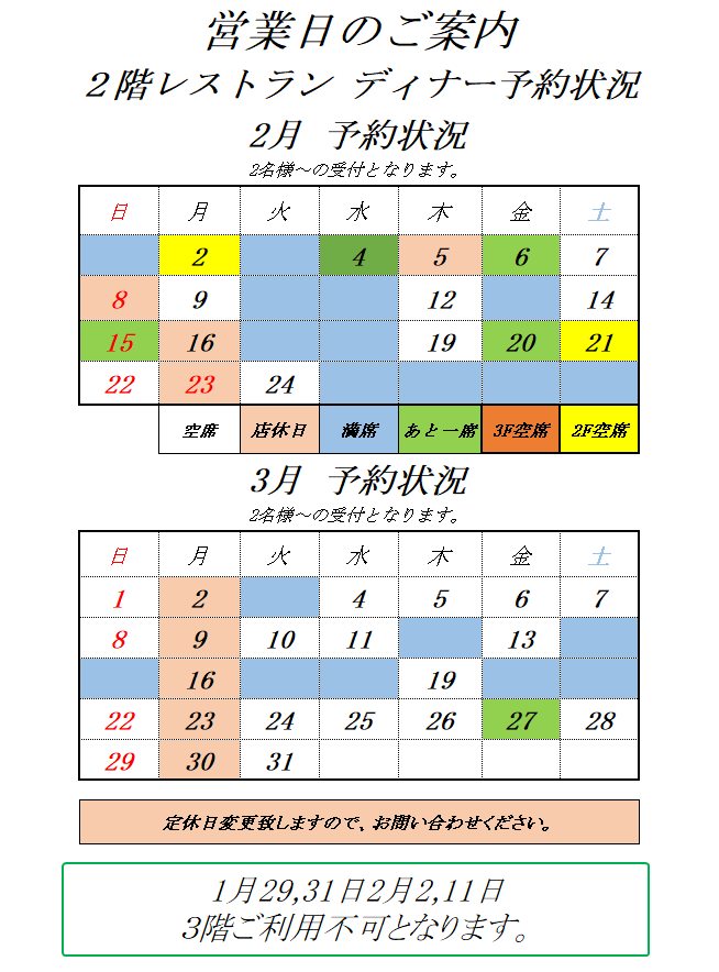 2,3月の空席情報更新致しました。